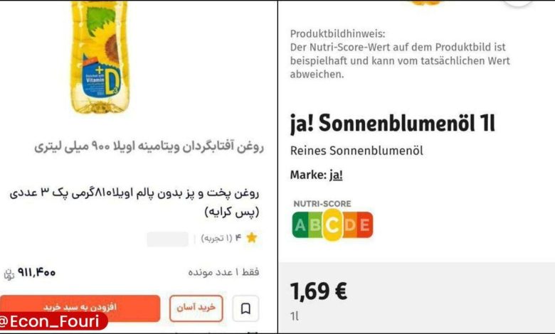 براساس تصویری منتشر شده، قیمت یک لیتر روغن آفتابگردان برند «ja» در آلمان ۱.۶۹ یورو اعلام شده است. با در نظر گرفتن هر یورو ۱۶۹ هزار تومان، قیمت این محصول در بازار آلمان حدود ۲۸۵ هزار تومان میشود.این در حالی است که در بازار ایران، روغن آفتابگردان اویلا با حجم ۹۰۰ میلیلیتر، ۳۰۳ هزار تومان قیمتگذاری شده؛ رقمی که نهتنها برای حجمی کمتر از یک لیتر است، بلکه از قیمت روغن در آلمان نیز بالاتر قرار میگیرد.
