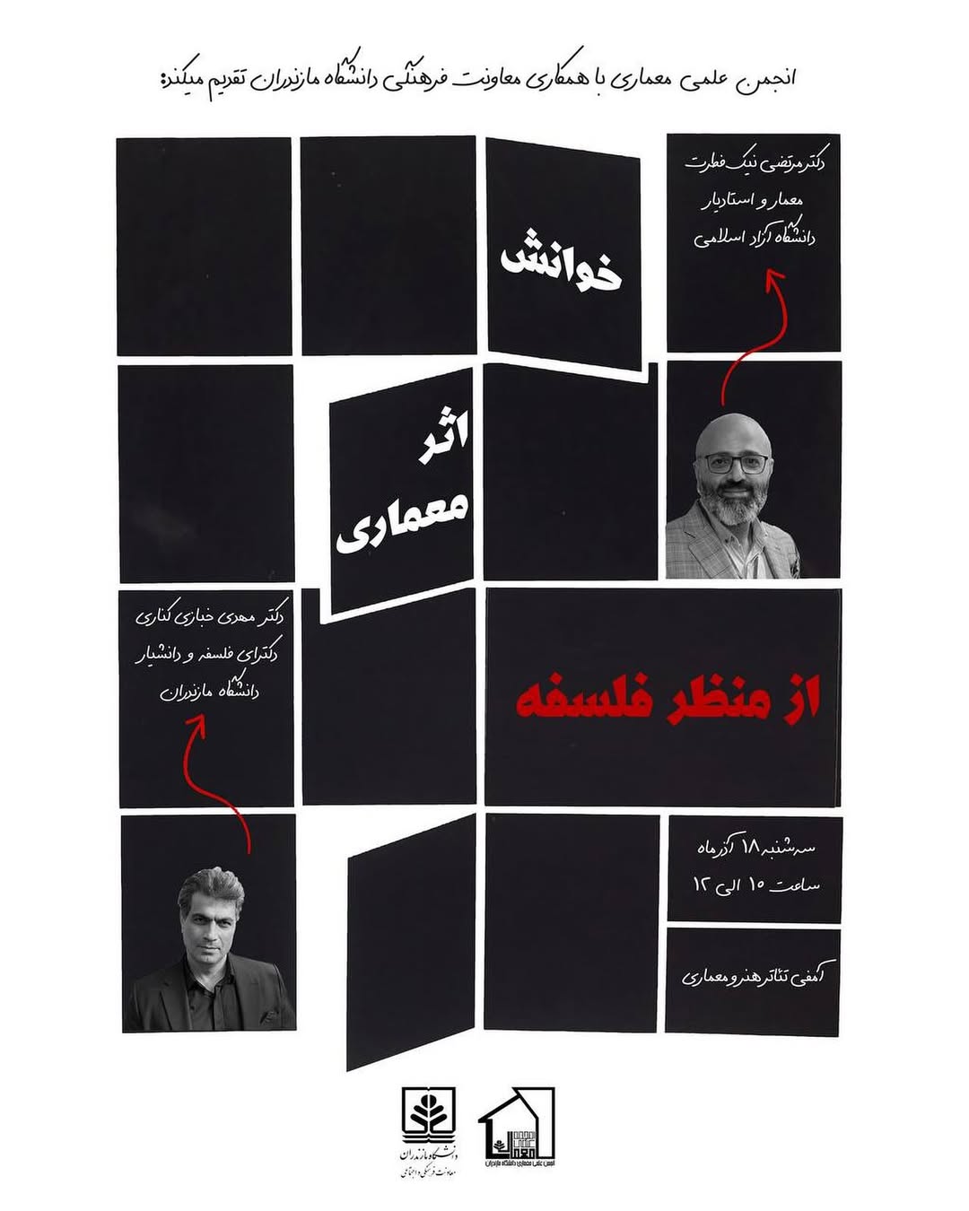 انجمن علمی معماری با همکاری معاونت فرهنگی دانشگاه مازندران تقدیم می کند: نشست خوانش اثر معماری از منظر فلسفه با حضور: دکتر مرتضی نیک فطرت «معمار و استادیار دانشگاه آزاد اسلامی» دکتر مهدی خبازی کناری «دکترای فلسفه و دانشیار دانشگاه مازندران» Source link