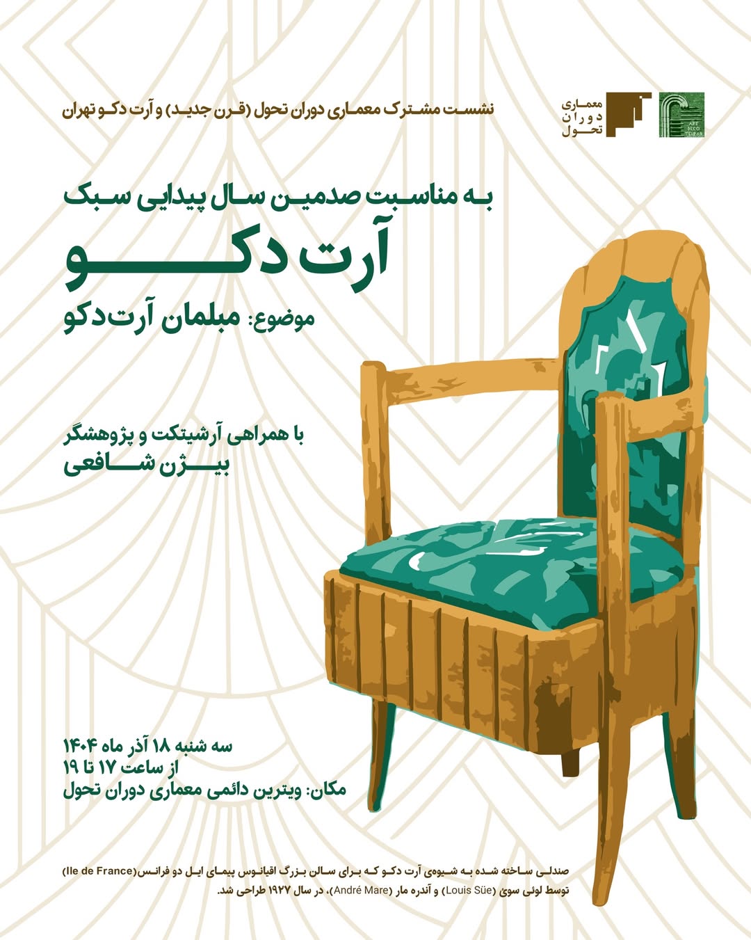 به مناسبت صدمین سال پیدایی سبک آرتدکو با موضوع مبلمان آرتدکو نشست مشترک معماری دوران تحول ( قرن جدید) و آرتدکو تهران با موضوع مبلمان آرت دکو با همراهی: آرشیتکت و پژوشگر بیژن شافعی با حضور در این رویداد، امکان بازدید از ویترین دائمی معماری دوران تحول (نمایشگاه اسناد و مدارک دفتر معماری مهندس هوشنگ سیحون) نیز فراهم است. سهشنبه 18 آذرماه 1404از ساعت 17 تا 19در ویترین دائمی معماری دوران تحول ظرفیت شرکتکنندگان…
