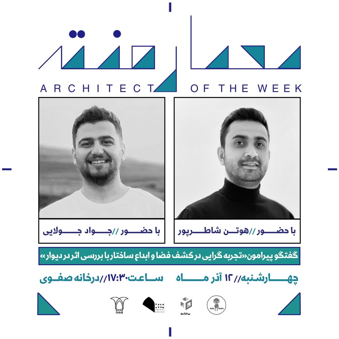 نشست پنجم از فصل هفتم معمارهفته گفتگو پیرامون«تجربه گرایی در کشف فضا و ابداع ساختار با بررسی اثر در دیوار » با حضور: جواد جولایی و هوتن شاطرپور جواد جولایی دانش اموخته دوره کارشناسی معماری دانشگاه آزاد اصفهانهمکاری های حرفه ای /– استوديو شفیعی – سال ۱۳۹۶– استوديو كاما – سال ۱۳۹۸ – مدیر برندینگ لکسون از سال ۱۴– استوديو تجربه – از سال ۱۴۲افتخارات و جوایزبرنده نشان طلایی AYDA جایزه طراح جوان آسیا ۲۰۱۸…